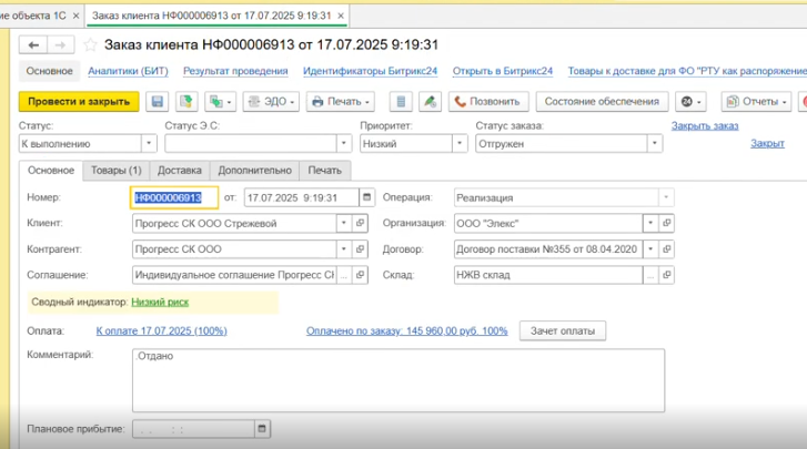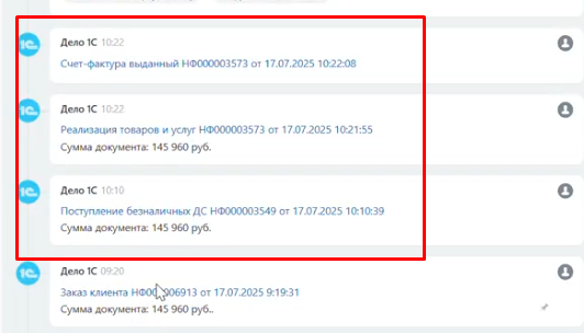 Результат: Менеджер видит полный заказ в CRM сразу после его оформления в 1С. Данные едины для фронт- и бэк-офиса.