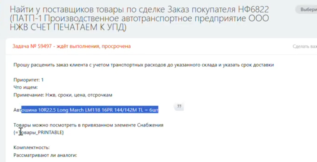 Снабжение: При переходе сделки на стадию “Передано в снабжение”: