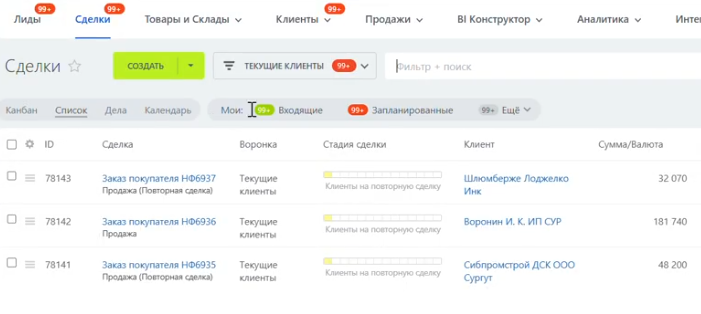 При создании “Заказа покупателя” в 1С в указанной воронке Битрикс24 — “Текущие клиенты” автоматически создаётся сделка.